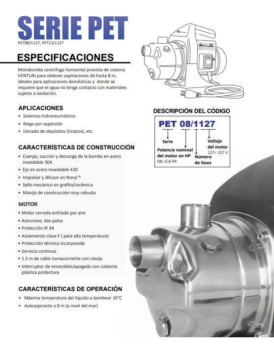 Tipo de producto Motobomba centrífuga (tipo jet) de superficie para agua limpia