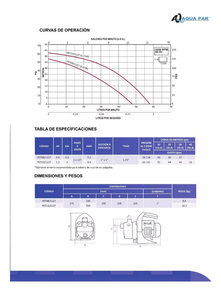 Diámetro mínimo sugerido para tubería de succión 1.25″