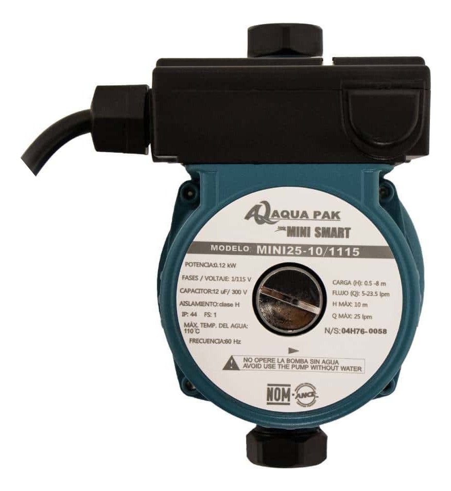 La Bomba Presurizadora Individual Aqua Pak MINI25-10/1115 es la solución ideal para garantizar un suministro de agua constante y eficiente en su hogar. Con una potencia de 120 W, esta bomba compacta ofrece un caudal máximo de 29 litros por minuto y una altura de elevación de hasta 9 metros, lo que la convierte en una opción perfecta para abastecer lavabos, boilers y lavadoras.