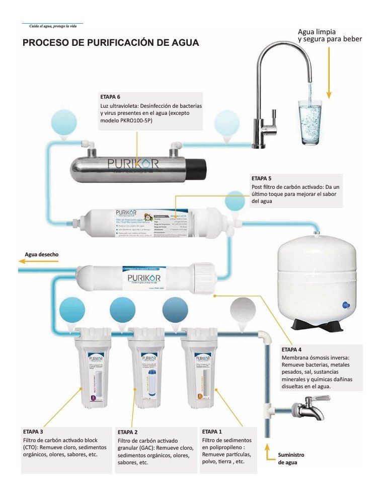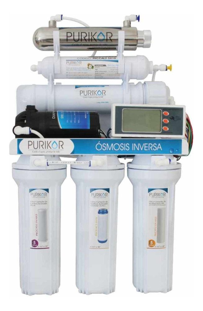 Incluye Bomba de presión, medidor TDS (ppm), lámpara UV PHILIPS, conexión de agua desecho, conexión para alimentación de agua, llave para portafiltros y portamembrana, mangueras tubing, tanque de almacenamiento y llave de ganso de lujo.